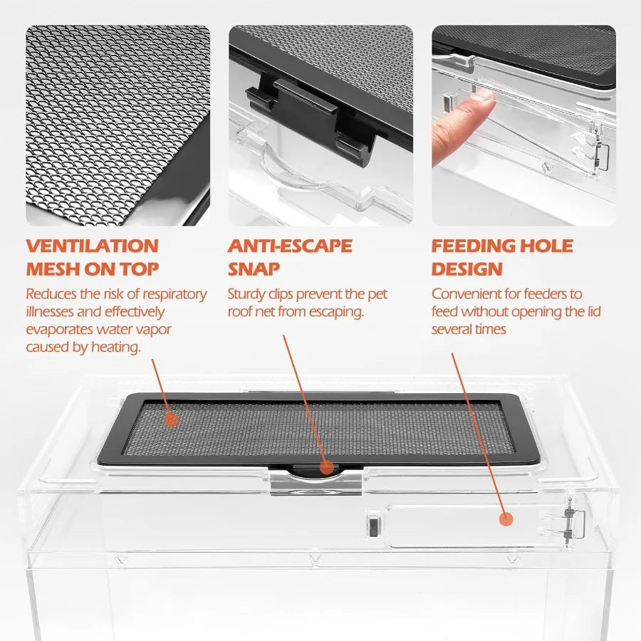 - Constructed from thick tempered PC for strength and safety, it provides a clear 360-degree view and a ventilated top that supports UVB and infrared exposure.
