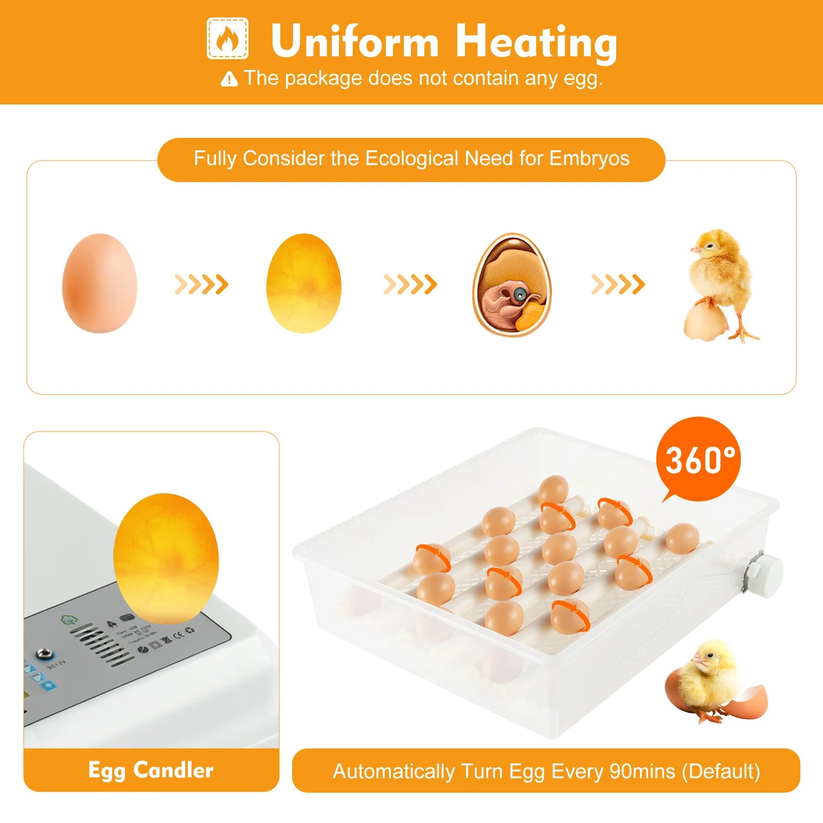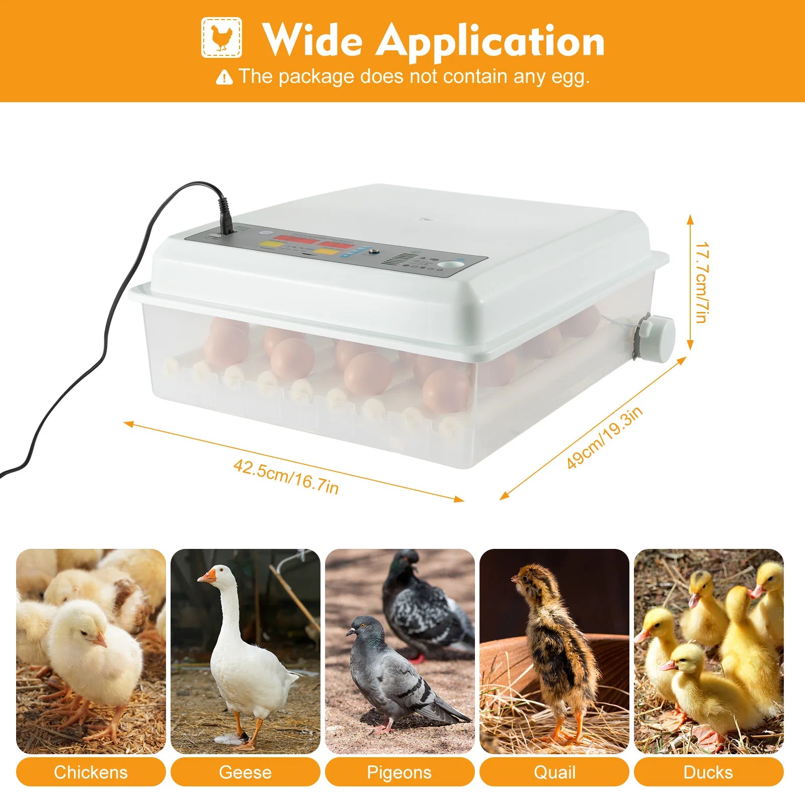 - Flexible capacity supports your incubation of multiple egg types: 64 chicken, 42 duck, 28 goose, 80 pigeon, or 120 quail eggs, including mixed batches.