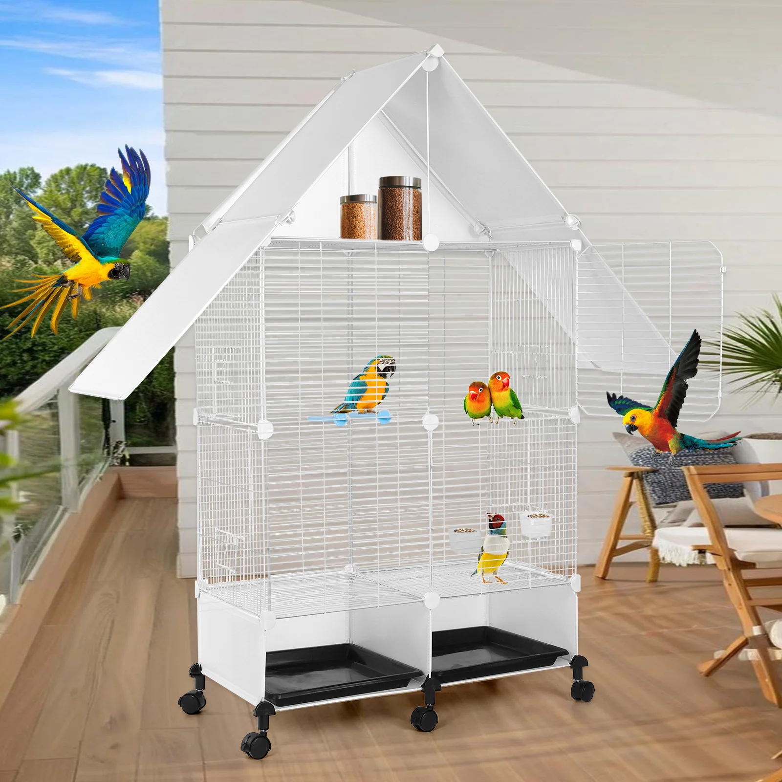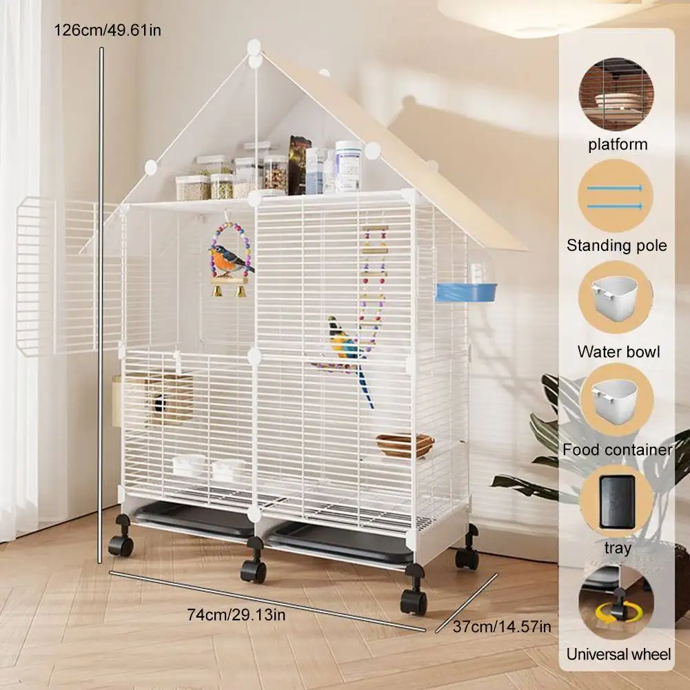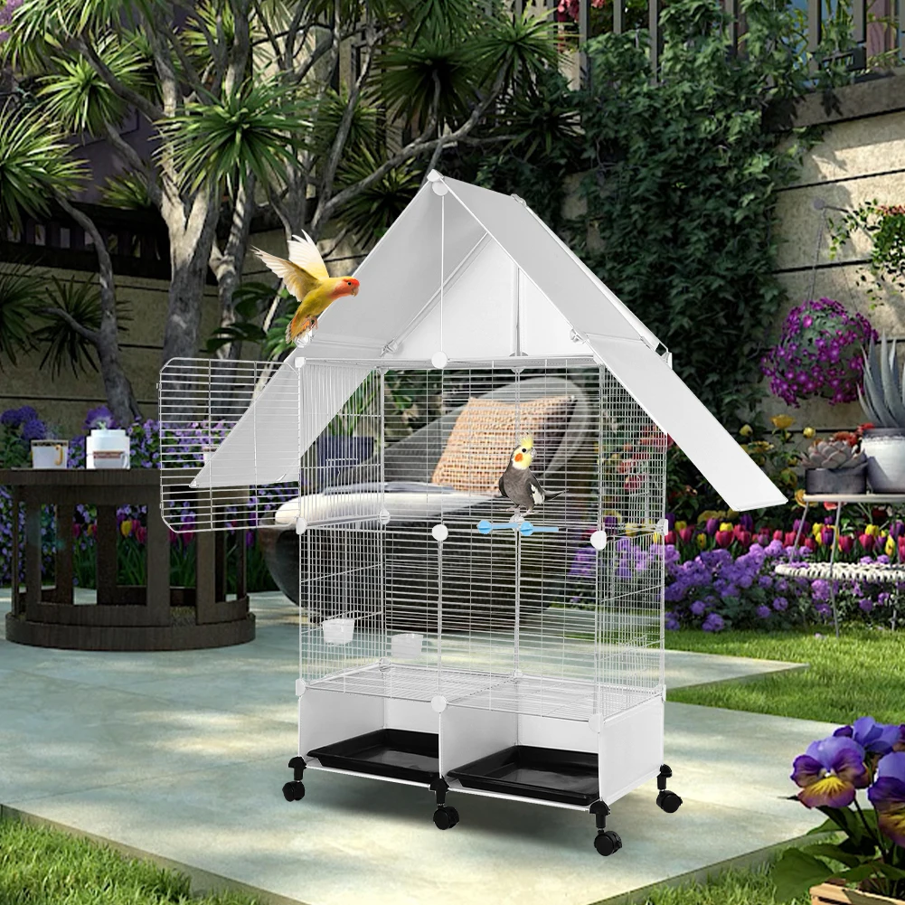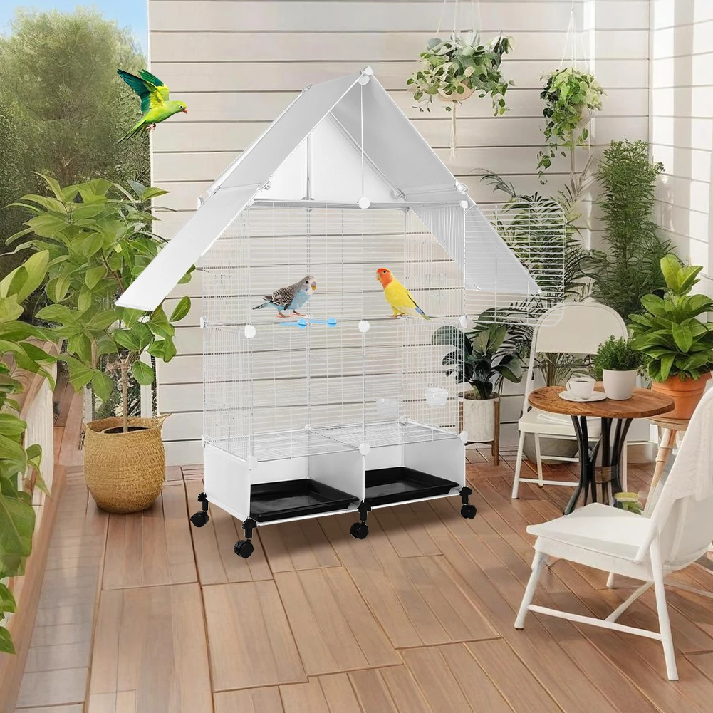 You can create a thriving, multi-pet aviary at home with this spacious, two-tier parrot cage that blends practical design with charming house-style aesthetics.