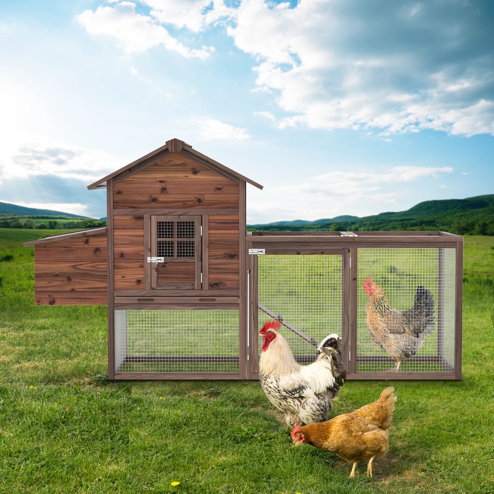 - You get generous space and versatility: elevated main house with a wide fenced run; 162" L x 27" W x 44.5" H, holds 8–12 chickens and suits small animals like rabbits or guinea pigs.