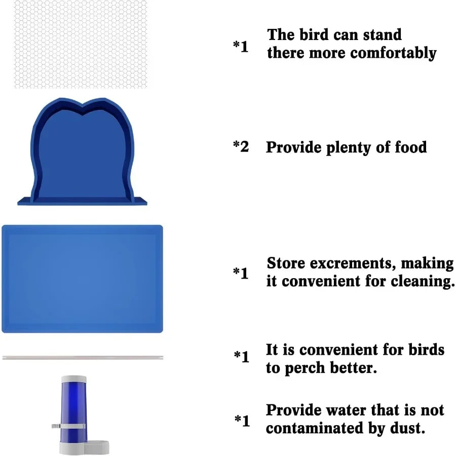 - You benefit from a versatile setup: includes 2 food dishes, a dust-proof water dispenser, and a wooden perch to support healthy eating and hydration.