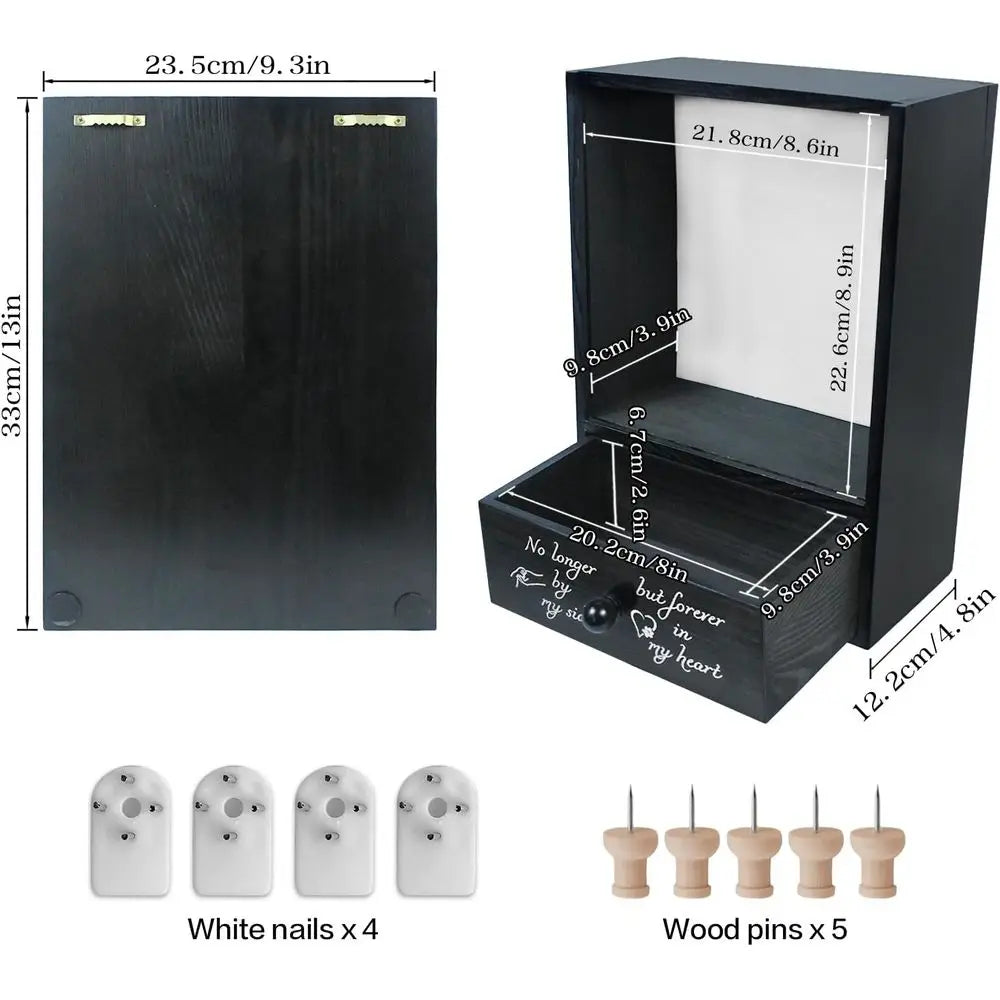 - With a 9.3 x 13 inch frame and an 8 x 3.9 inch drawer, you can store photos, paw prints, collar, ID tag, birth certificate, toys, and even an urn.