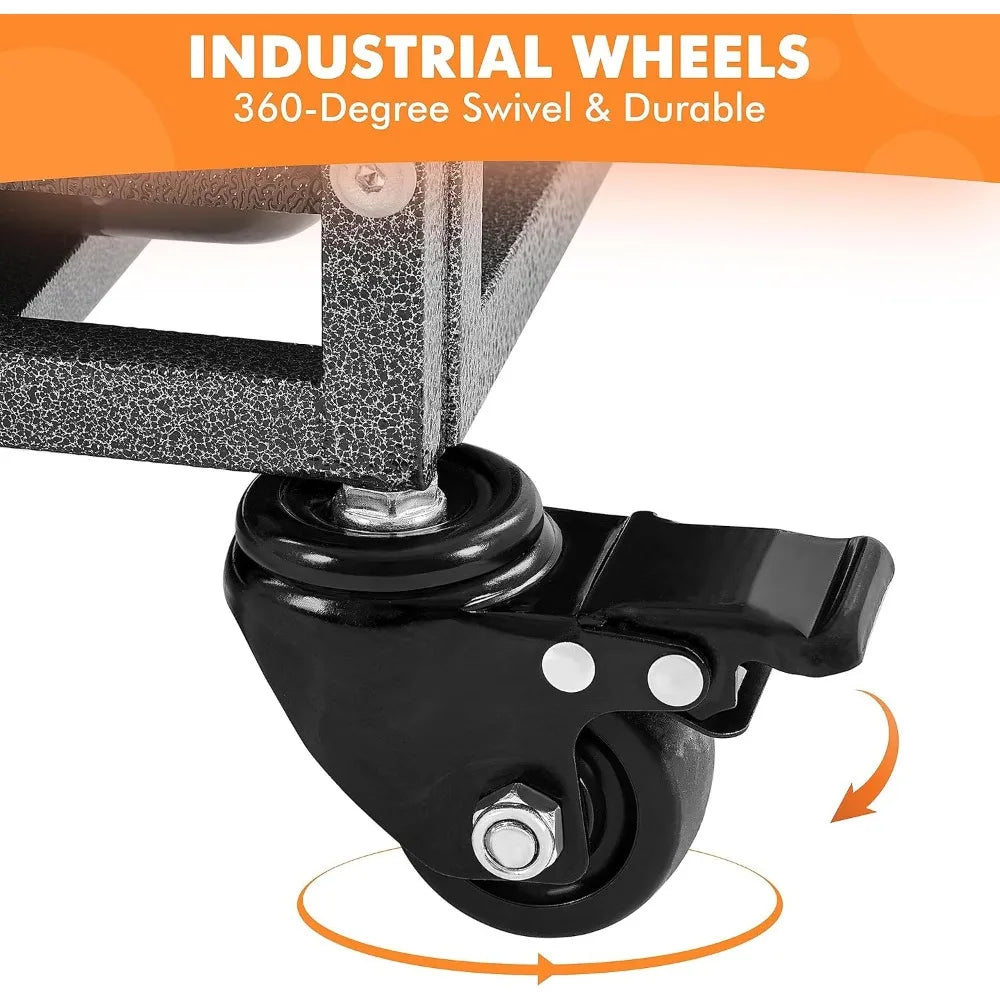 - Move it with ease on four smooth-rolling industrial wheels, two of which lock, and enjoy quick, tool-free setup with included hardware.