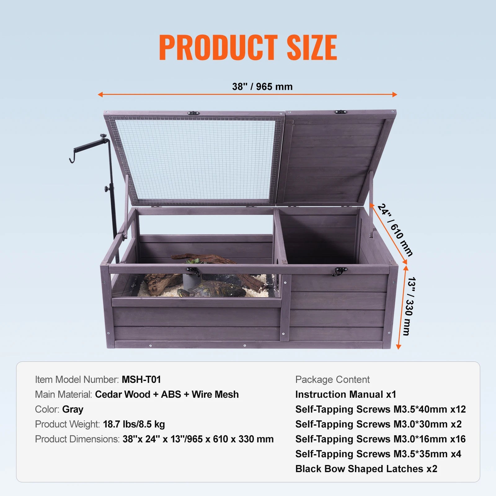 - Escape-Proof and Easy to Maintain: Lockable top cover, durable metal mesh, removable lids, and a waterproof ABS tray simplify upkeep and safety.